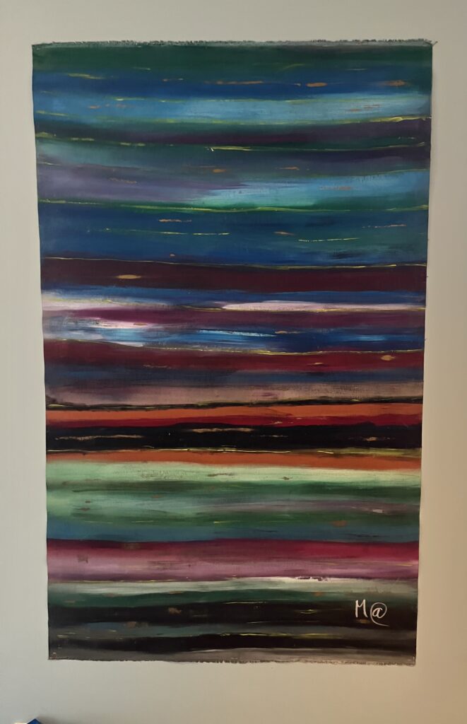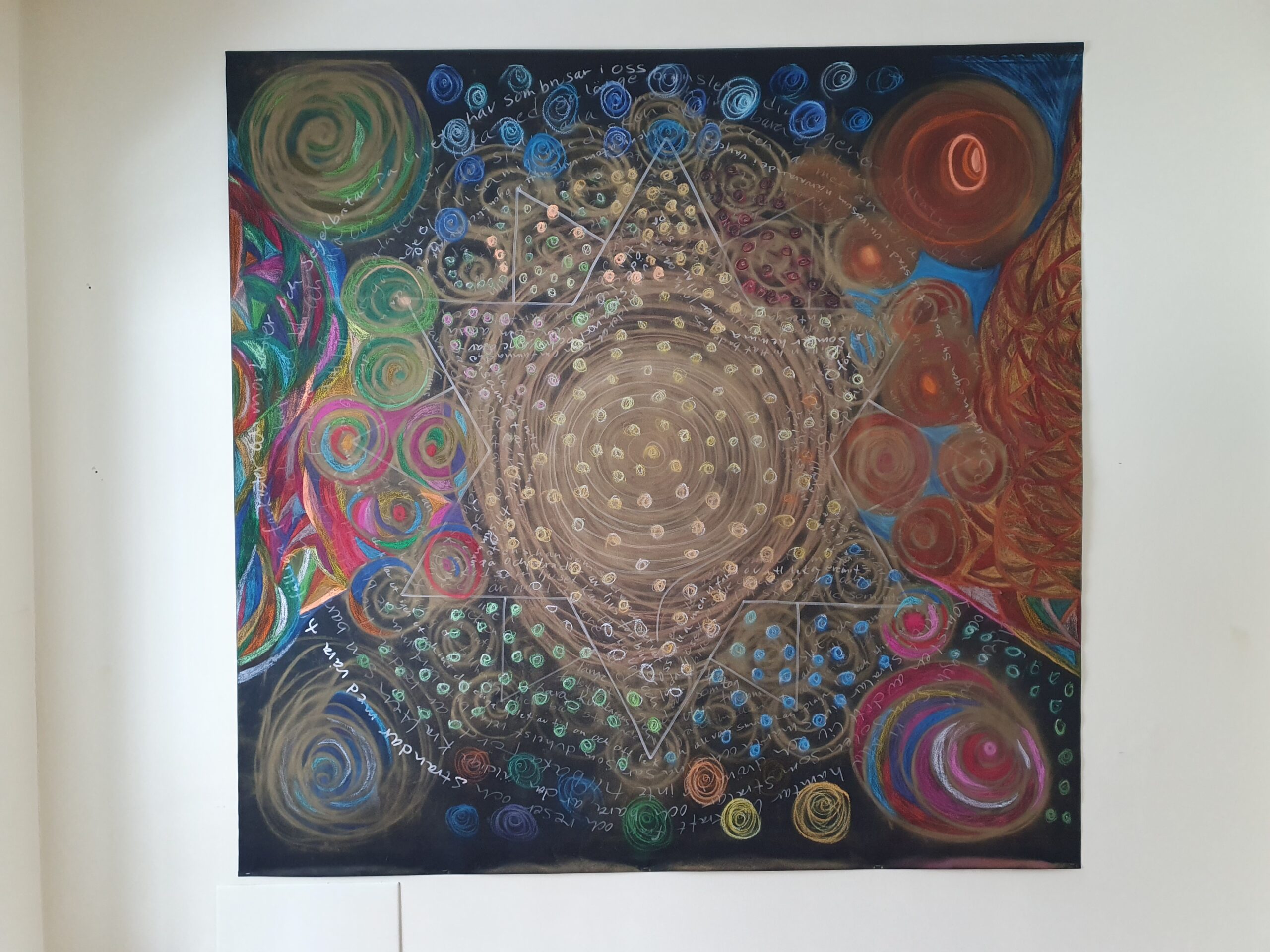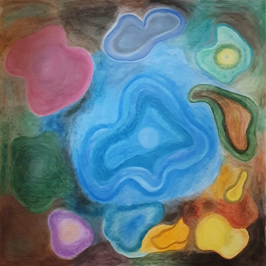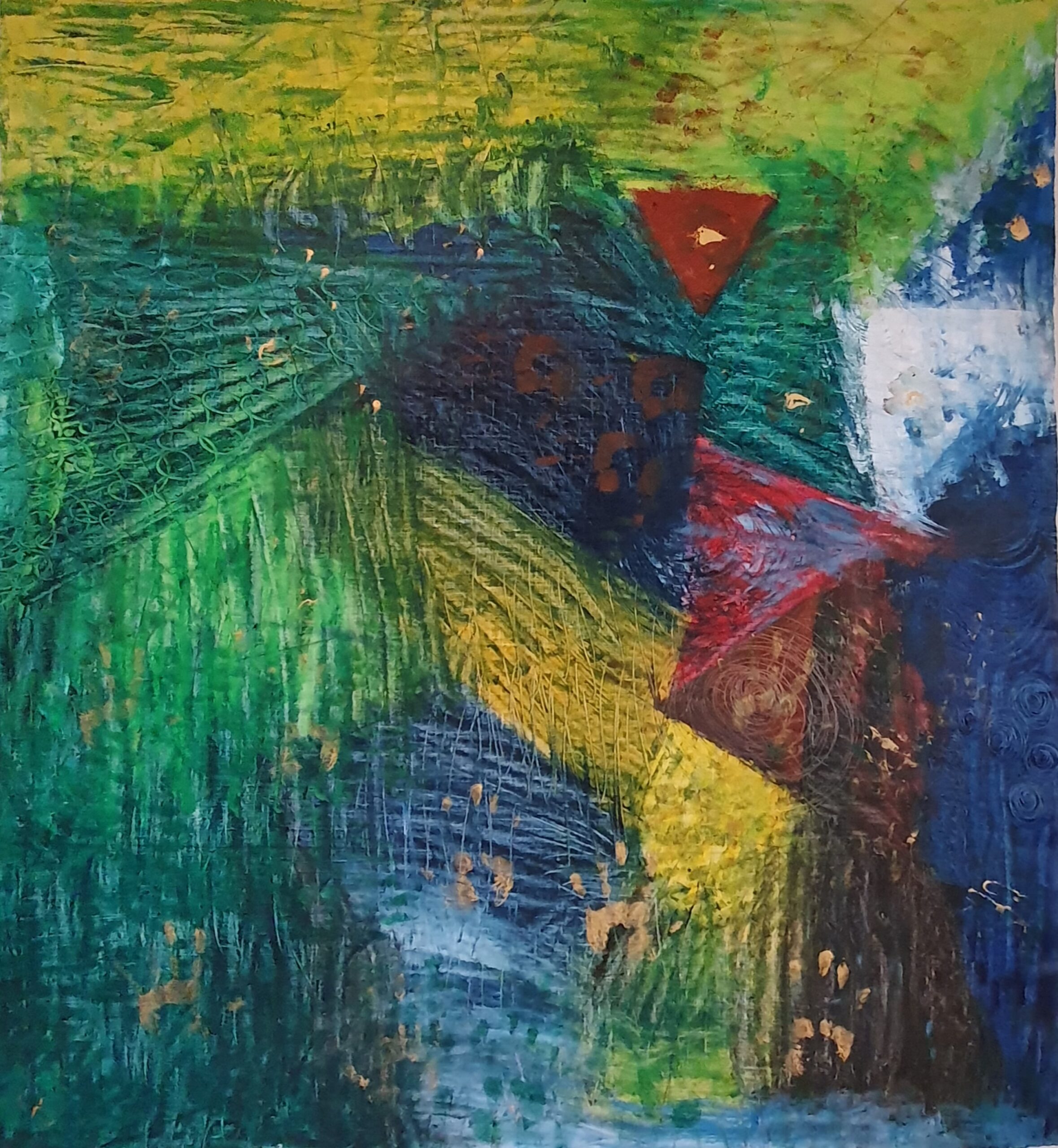 Jag trodde länge att de färger som jag omslöt mig med i vardagen – de i skogen, blommornas ljuvliga färger och färgsättningen i hemmet var nog. Men något mer ville få blomma i mitt liv – det kreativa skapandet med färger. Så jag tog mod till mig, i väninnan Mona Waldemars lusthus – att greppa penseln och måla för lustens skull, för färgerna, för att berkriva vad mitt inre öga såg. Inte föreställande bilder, det har jag ingen som helst fallenhet för, utan den abstrakta konstens outgrundliga eviga värld. Målandet som en del av min andliga väg. Hela mitt liv är min konst. Allt jag är och gör är mitt konstnärsskap. Oavsett om jag skriver BOKEN OM MITT LIV, målar en abstrakt tavla, krattar fram en skogskatedral, berättar en saga eller sörjer för att gamla BACKSTUGOR blir renoverade.