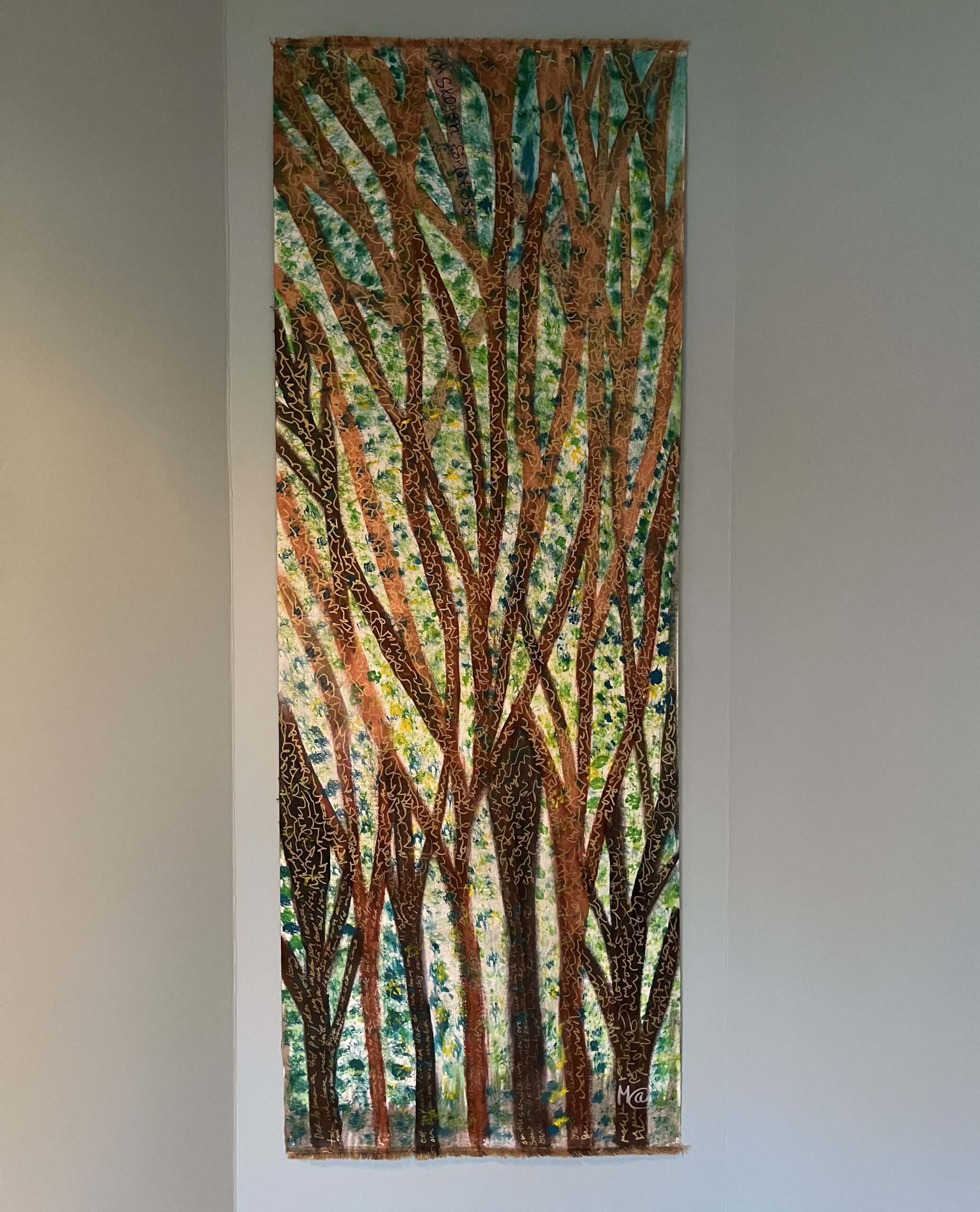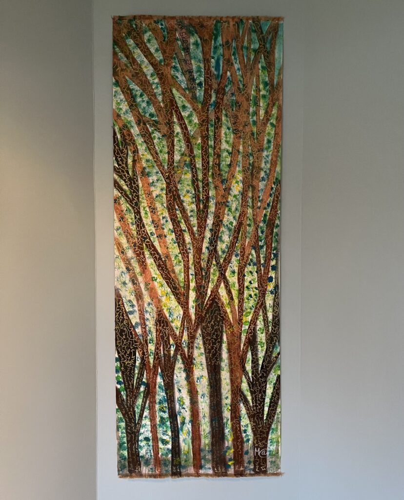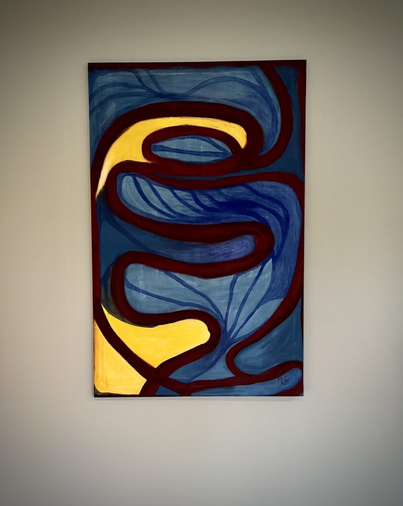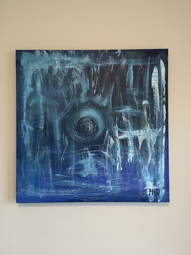 Jag trodde länge att de färger som jag omslöt mig med i vardagen – de i skogen, blommornas ljuvliga färger och färgsättningen i hemmet var nog. Men något mer ville få blomma i mitt liv – det kreativa skapandet med färger. Så jag tog mod till mig, i väninnan Mona Waldemars lusthus – att greppa penseln och måla för lustens skull, för färgerna, för att berkriva vad mitt inre öga såg. Inte föreställande bilder, det har jag ingen som helst fallenhet för, utan den abstrakta konstens outgrundliga eviga värld. Målandet som en del av min andliga väg. Hela mitt liv är min konst. Allt jag är och gör är mitt konstnärsskap. Oavsett om jag skriver BOKEN OM MITT LIV, målar en abstrakt tavla, krattar fram en skogskatedral, berättar en saga eller sörjer för att gamla BACKSTUGOR blir renoverade.